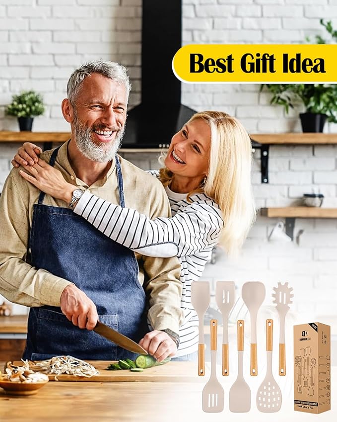 Silicone Kitchen Utensil Set for Non Stick Cookware, 7 Pcs Heat Resistant Cooking Utensils with Wooden Handle, BPA Free Kitchen Tools with Spatulas, Spoons, Skimmer and Pasta Fork (KHAKI)