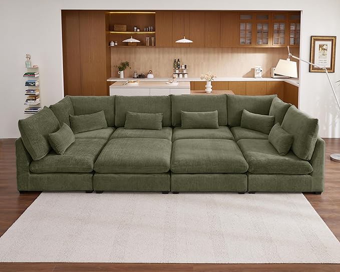 Oversized Modular Sofa, Extra Deep Cloud Corduroy Sectional Couch with Ottoman Chaise, Fluffy Chenille L-Shaped Sofas for Living Room, Villa (Sofa Bed 8 Seater, Chenille Green)