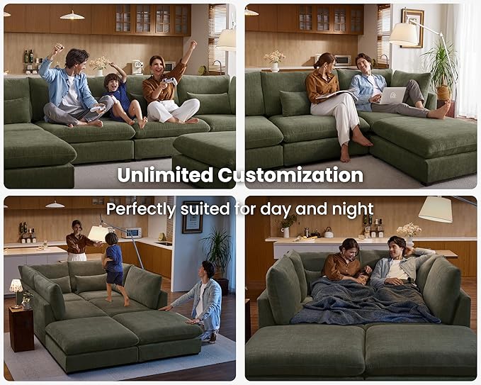 - 【Endlessly Modular for Tailored Space】Transform your space with ease using the fully modular design. Whether you need a cozy L-shape for movie nights, a U-shape or a spacious sleeper for entertaining, each piece reconfigures to fit your needs. This sectional adapts to any room, offering customizable comfort. Perfect for living rooms, home offices, or entertainment spaces, it provides flexibility without complicated tools. Enjoy seamless reconfiguration for relaxing, working, or entertaining