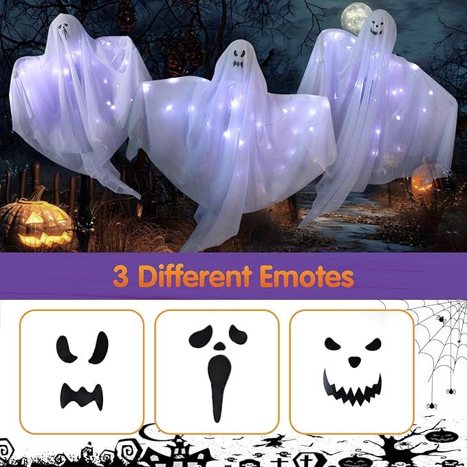 - Halloween Hanging Ghosts: Our flying ghost Halloween decoration features 3 different horrible ghost expressions, each emitting a spooky glow. Easily add mysterious & scary looks to your home, making your Halloween night more memorable.
