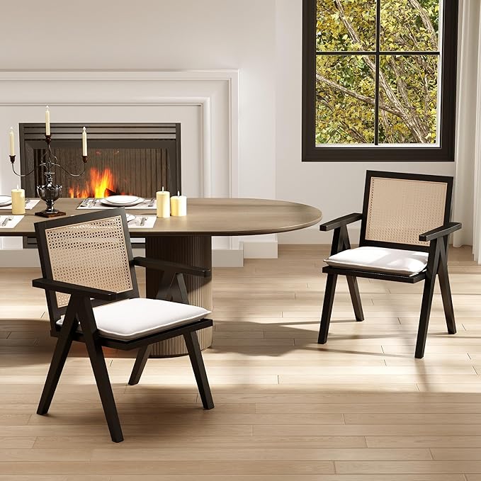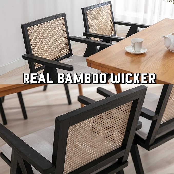 Rattan Dining Chairs Set of 2, Farmhouse Wicker Dining Chairs with Removable Linen Cushion Accent Cane Armchair for Dining Room Kitchen Restaurant, Black