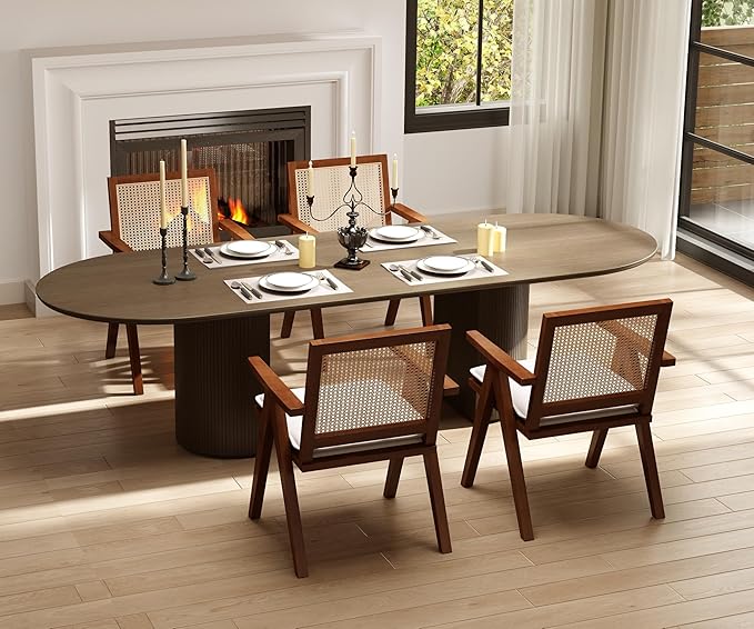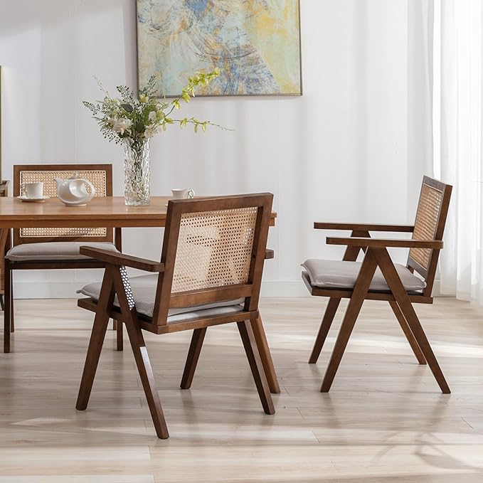Rattan Dining Chairs Set of 4, Farmhouse Wicker Dining Chairs with Removable Linen Cushion Accent Cane Armchair for Dining Room Kitchen Restaurant, Walnut
