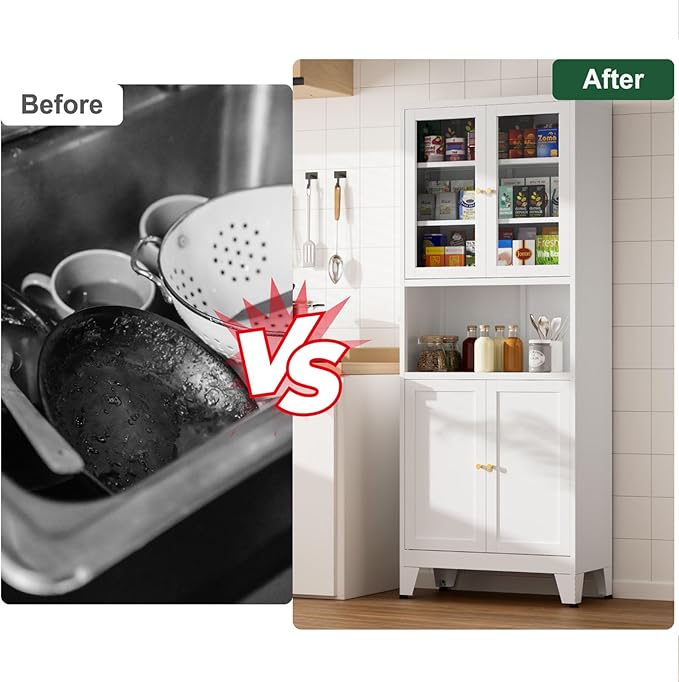 - Multi-functional Applications: The metal pantry cabinet with 4 magnetic doors and adjustable shelves, you can adjust the height of the shelves to suit the storage needs of different sized items. This cabinet is suitable for kitchen, dining room, living room, bathroom and also can be used as a bookcase