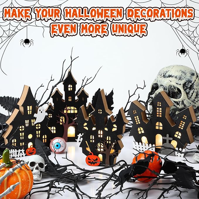 - Spooky Halloween Village Set: this 4 piece Halloween tabletop decoration set features wooden lighted ghost house designs; Ideal for creating a haunted village or adding eerie charm to your space, these mini houses cast a ghostly glow to set the Halloween mood