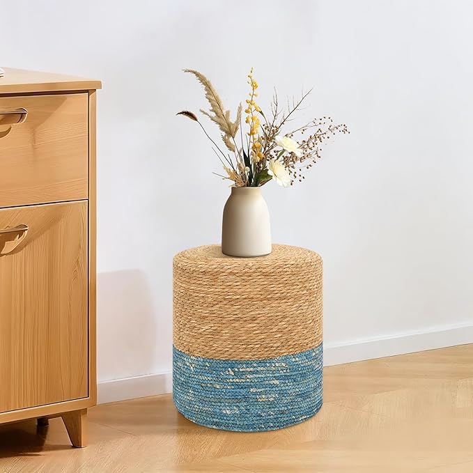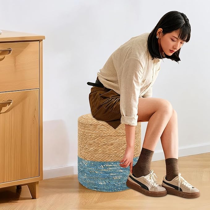 Pouf Ottomans, Handwoven Natural Straw Footstool, Round Braided Outdoor Patio Stool with Wood Frame, Boho Decor Accent Seat Balcony, or Garden (Blue)