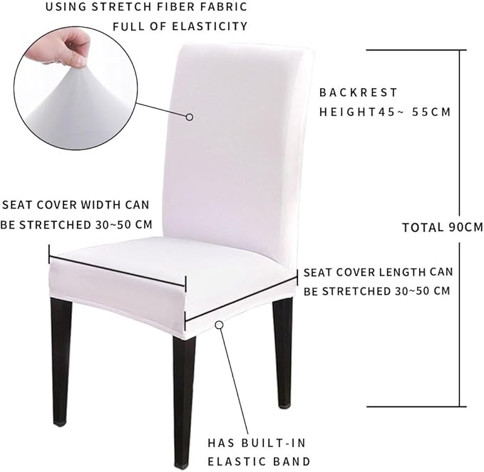 - [Very Suitable for Chair Size]: Backrest Height- 40-50 cm; Total Seat Length- 90cm. The length and width of the chair protector can be stretched 30-50cm, built-in elastic band, suitable for most seats. Package includes: 4pcs x dining chair covers.