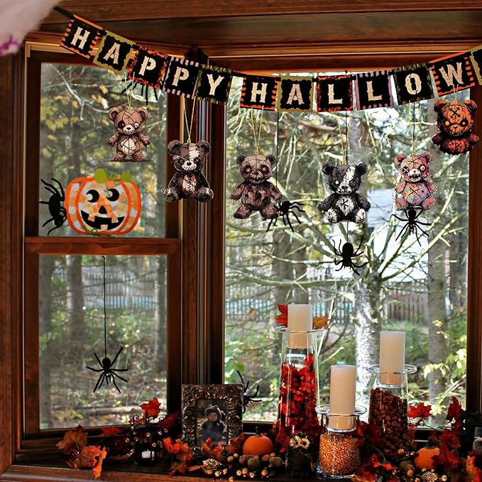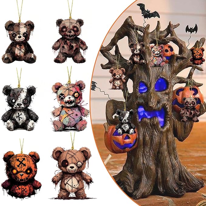 Halloween Tree Decoration, 6 Pcs Cute Acrylic Pendant, Terror Cartoon Bear Halloween Accessories, Funny Cartoon Christmas Tree Ornaments for Mini Decorations Indoor Outdoo