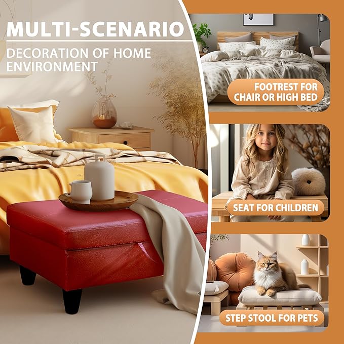 - PREMIUM MATERIALS: This storage ottoman features a thick foam cushion for added comfort. Built with a sturdy solid wood frame and durable plastic feet, it offers long-lasting quality while protecting your floors from scratches. The easy-to-clean faux leather surface gives it a sleek, modern look, and the smooth faux leather lid adds an extra layer of comfort for sitting. Perfect for any room, this ottoman combines style, durability, and functionality.