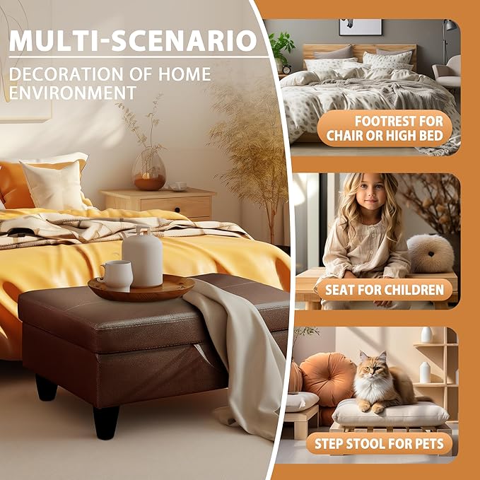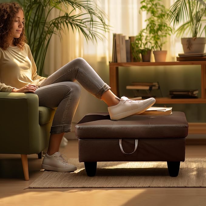 - PREMIUM MATERIALS: This storage ottoman features a thick foam cushion for added comfort. Built with a sturdy solid wood frame and durable plastic feet, it offers long-lasting quality while protecting your floors from scratches. The easy-to-clean faux leather surface gives it a sleek, modern look, and the smooth faux leather lid adds an extra layer of comfort for sitting. Perfect for any room, this ottoman combines style, durability, and functionality.