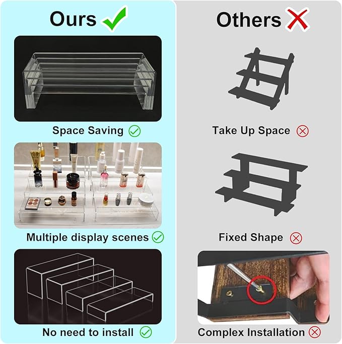 - 【Excellent Visual Presentation】: This clear risers display stands is made of transparent food-grade acrylic, which can clearly show what you want to display, sophisticated and stylish. 3 tier risers display stands provide a floating visual effect for the placed items and properly arrange storage.