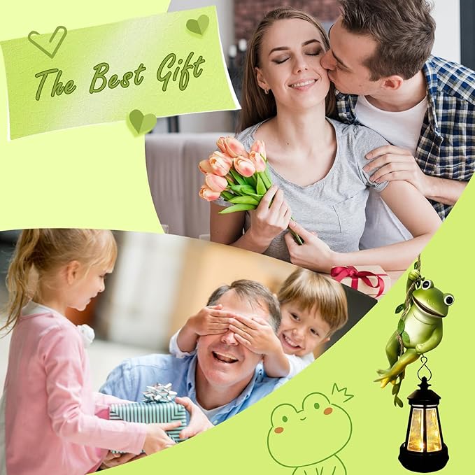 - 【Cute Climbing frog garden sculpture for wide use】- Total length 23.62 inch(60cm). The frog outdoor hanging decor in a vivid appearance, clutches a vine and holds a solar lantern. The vine comes with an “S” hook on the top, ensuring you can hang the solar garden statue anywhere you like to leave a lasting impression on your guests. The outdoor solar statues are perfect accents for Patio/ Home Windows/ Front Porch/ Backyard Decor, House Fences or Tree Branch Decorations outside.