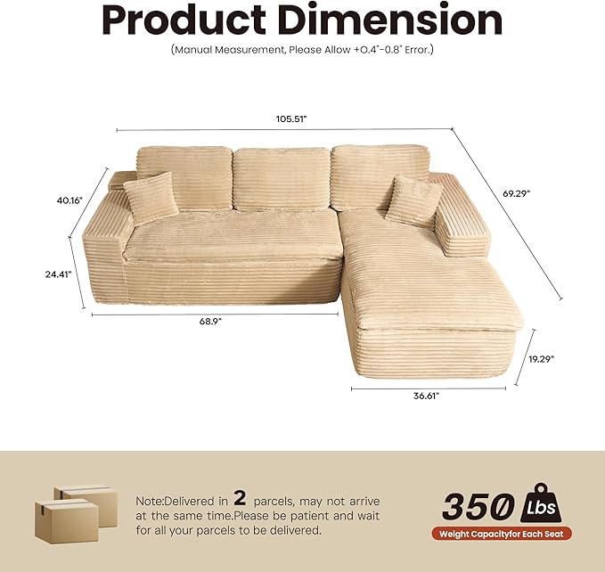 ovios 105” Modular Sectional Sofa with Thicken Seat Cushion, Cloud Couch with Deep Seat, Modern L-Shape Sofas Couches with Chaise,Upholstered Couches for Living Room Bedroom,Beige