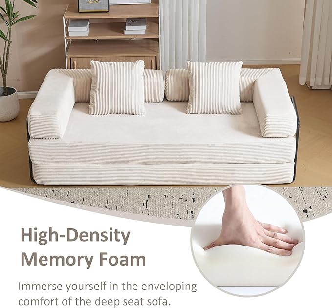 Convertible Sleeper Sofa Bed, Compression Folding Sofa with Pillow, No Assembly Required, Shape Frame, Floor Sofas Lounge Couch for Living Room, Bedroom, Small Spaces(Corduroy, 77''W, Off-white)