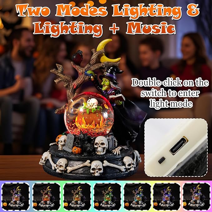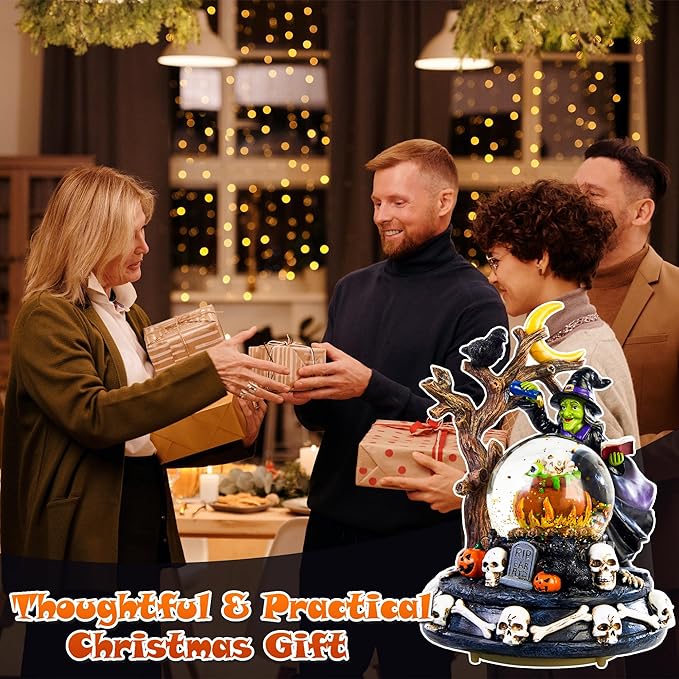 - ๐ใ Halloween Snow Globes ใ This beautifully detailed, lighted snow globe features hand-carved Halloween designs. 6 x 6 x 8 inch snow globe depicts a witch casting spells over a cauldron under moonlight, holding a potion vial and spellbook. The scene is surrounded by a black cat, raven, skull, tombstones, and pumpkins. The crystal ball is installed on a black base with a retro and mysterious carving, on which skeletal figures are engraved, exuding a truly strange atmosphere.