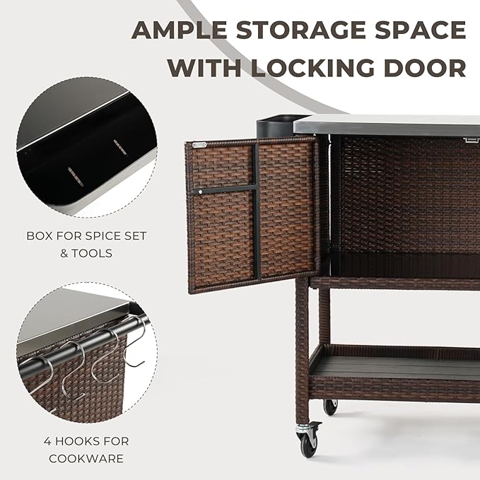 - Sturdy Material: The outdoor bar cart is made with powder-coated steel frame and weather-resistant wicker for years of use. Solid stainless steel table top for displaying appetizers and beverage