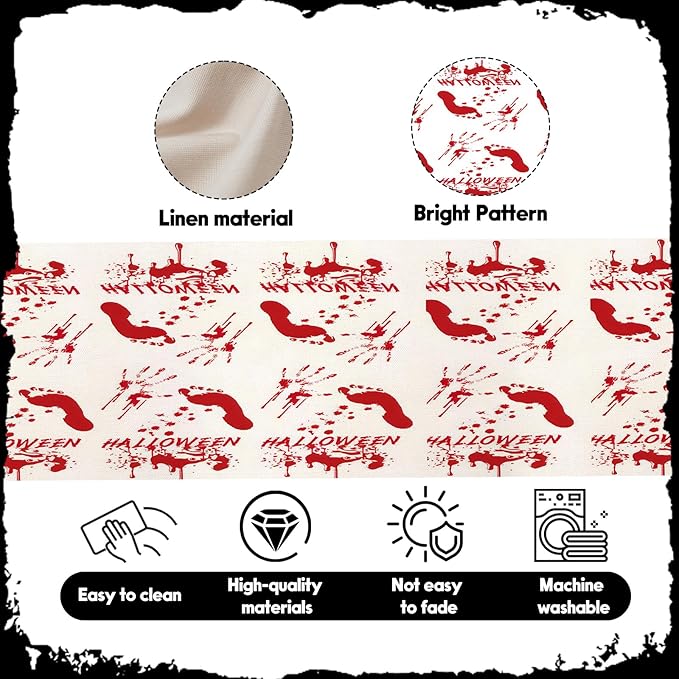 - Package Content: Includes 1 Halloween table runner (13x36 inches) with red bloodstains and footprints printed on it, these classic Halloween elements instantly turn your dining table into the focus of the holiday
