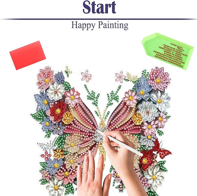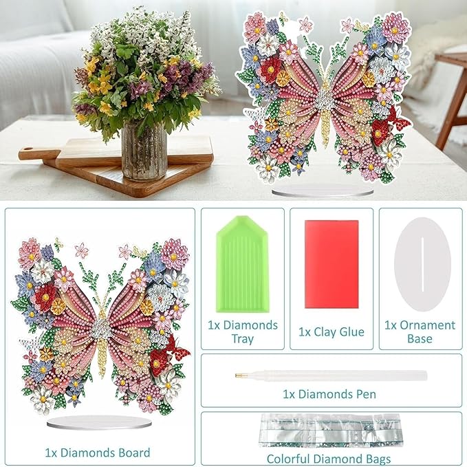 Diamond Painting Kits for Adults Beginners, 5D Full Drill Flowers and Butterflies Crystal Art Desktop Ornament, DIY Single Sided Home Office Desk Decor, Creative Craft Gift Set with Tools