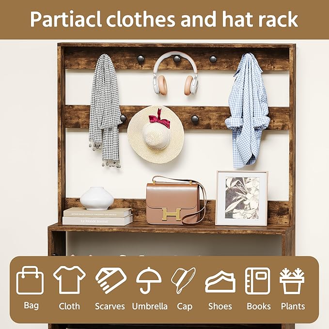 - 【Shoe Cabinet with 9 Hooks】Farmhouse shoe cabinet includes 9 coat racks, a top storage shelf, and 3 drawers; The shoe cabinet with hooks is ideal for hanging clothing, umbrellas, bags, and more; The spacious top shelf and desktop is perfect for storing keys, phones and wallets; It caters to various daily storage requirements, assisting you in keeping a clutter-free and tidy home