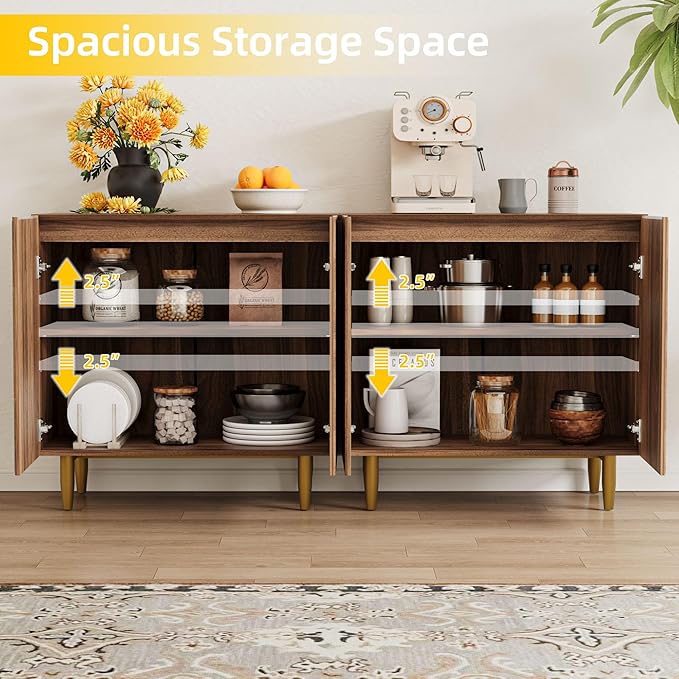 65 Inch Fluted TV Stand, Mid Century Modern Entertainment Center with Storage Cabinets & Adjustable Shelves, Media Console TV Credenza for Living Room, Dining Room, Hallway, Walnut