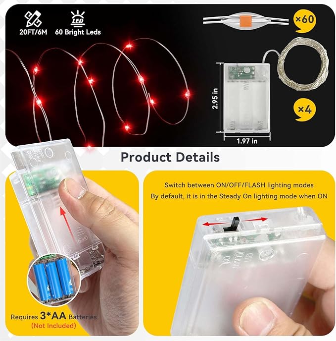 4 Pack 60LED Christmas Fairy Lights Battery Operated - 20FT Twinkle Lights with 2 Lighting Modes Indoor Outdoor, Waterproof Led Fairy String Lights for Bedroom, Wedding, Dorm, DIY Decor, Red