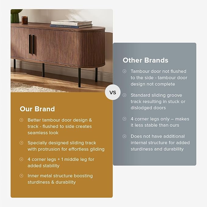 - Design: Mid-century modern TV stand with slatted door design and adjustable shelves. Multiple storage spaces for your consoles