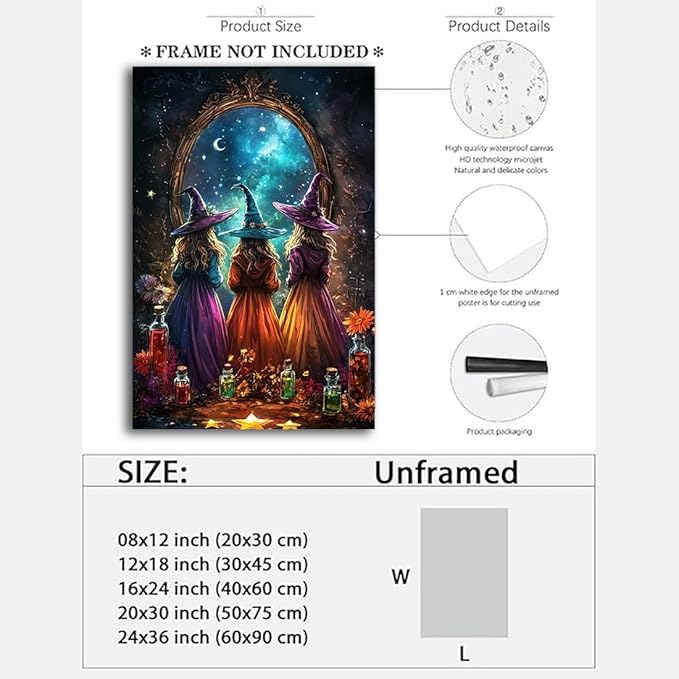 Witch Poster Halloween Fall Wall Art Decor,Three Witches with Magic Potion Mirror Colorful Vintage Print,Dark Academia Spooky Canvas Art Prints for Home Living Room,20"x30" Unframed