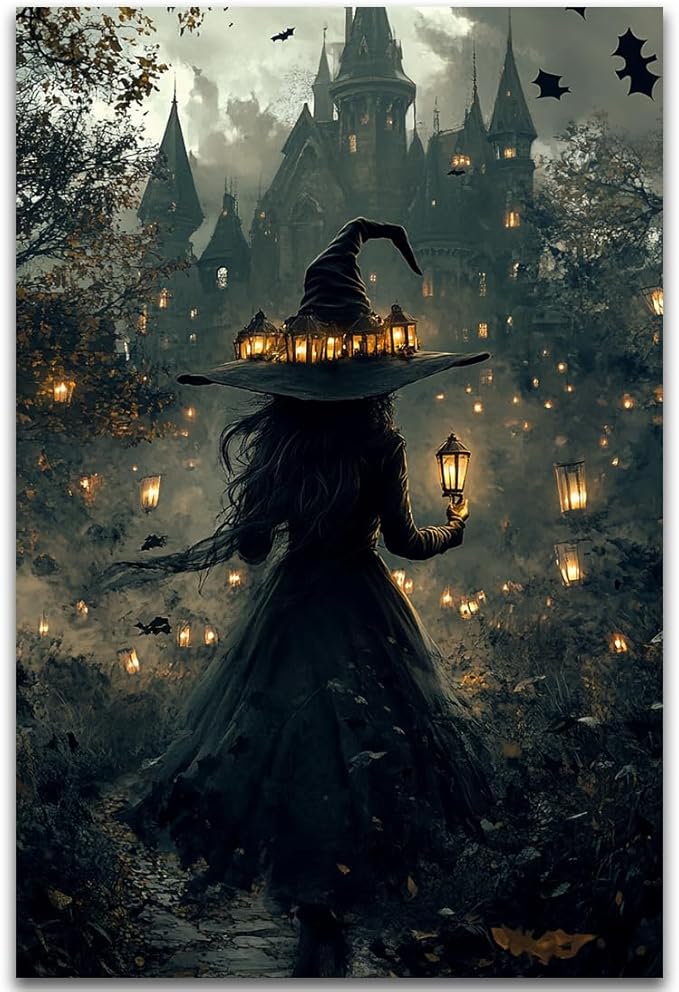 Halloween Witch and Haunted House Canvas Wall Art,Dark Academia Scary Witch Castle Posters Prints,Thriller Horror Gothic Wall Decor Pictures for Halloween Party House Decoration,20"x30" Unframed