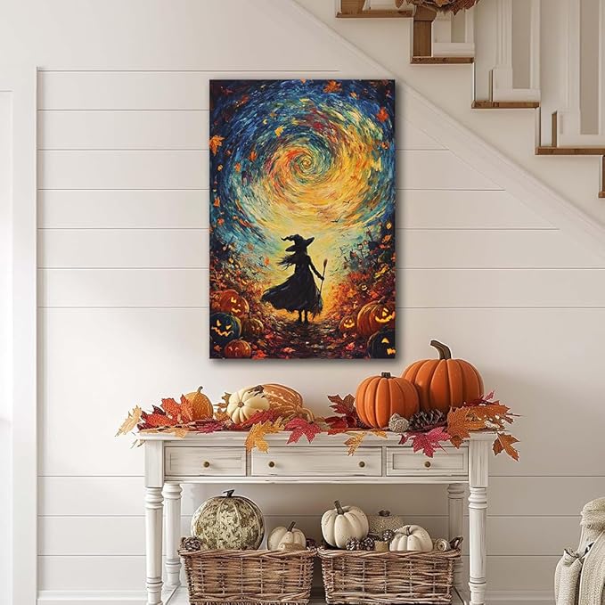 Halloween Autumn Witchy Decor Wall Art Prints,Gothic Witch in Whirlwind Autumn with Pumpkins Scene Pictures Poster,Fall Festival Home Decor Painting Canvas Poster for Bedroom Bathroom,20"x30" Framed
