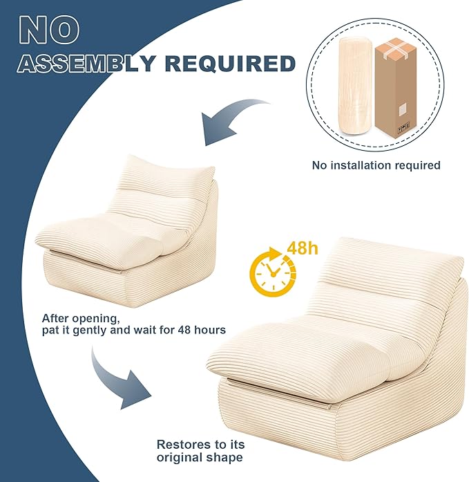 - 【No Assembly Required】There is no need to assemble the beanbag, just open the compressed package and allow it 24-48 hours to regain resilience. After total expansion, you can recline and relish a fantastic time. It's chill to kick back and it's great for watching TV, reading books and even family time. Due to compressed packaging, the fabric may have wrinkles upon opening. Let it sit for 24-48 hours to reach its optimal state. Afterward, you can gently smooth out the fabric or lightly iron it for a more polished look.