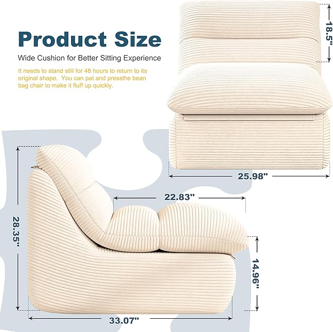 Misolant Bean Bag Chairs,Big Corduroy Fabric Sofa Bean Bag Chair for Adults and Teens with High-Resilience Sponge, Non-Slip Base Floor Lounge Sofa for Home, Living Room, Bedroom, Gaming Beige White