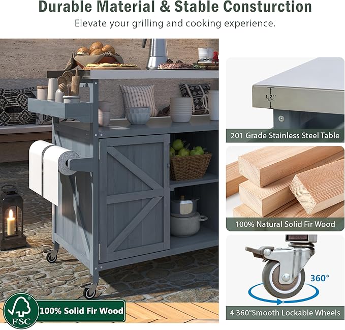 - [Heavy Duty Structure] Crafted from 100% exquisite fir wood, this outdoor bar cart exudes natural charm while prioritizing skin-friendliness and minimal chemical coatings. The 1.2-inch thick 201 stainless steel tabletop offers an easy-to-clean and durable spacious grill table for preparing food ready for cooking. Exclusively designed in your house, we guarantee a long-lasting and sturdy product.
