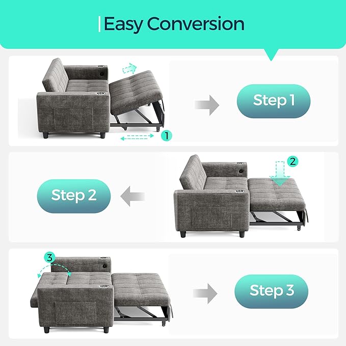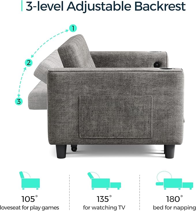 - 3 in 1 Pull Out Sofa Bed: Simply pull the strap and use the hidden wheels to easily convert it into a recliner and sofa bed. The backrest offers three adjustable angles: 105°, 135°, and 180°, ensuring a comfortable experience. Maximize your living area with three smart configurations: Loveseat, chaise longue and guest-ready pull-out sofa sleeper