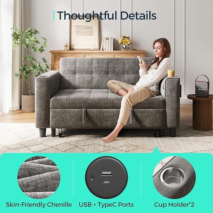 - Premium Comfort:Chenille fabric has a soft and comfortable texture, durable and resistant. Its unique texture adds a sense of quality to the sleeper sofa, while also offering excellent warmth, making it suitable for all seasons. This sofa bed is perfect for studio apartments or impromptu guest accommodations, seamlessly transitions between casual seating and overnight hosting solutions