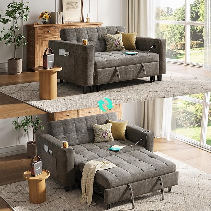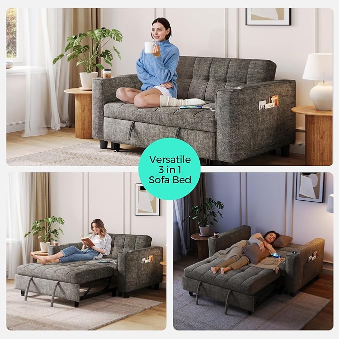 LINSY 3-in-1 Convertible Sofa Bed, 54" Pull Out Sleeper Sofa with Charging Station & Cup Holder, Small Folding Loveseat with Side Pocket for Small Space, Corduroy Couch, Gray