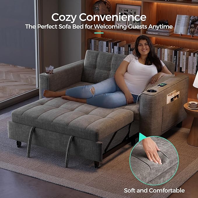 - Convenient Sleeper Couch:This convertible futon bed is thoughtfully designed with a charging station, allowing you to conveniently charge multiple devices through both USB and Type-C ports. The built-in cup holders make it easy to place your drinks, preventing spills. The side storage pocket offers additional space to keep magazines, remote controls, and other small items, adding extra convenience to your everyday life