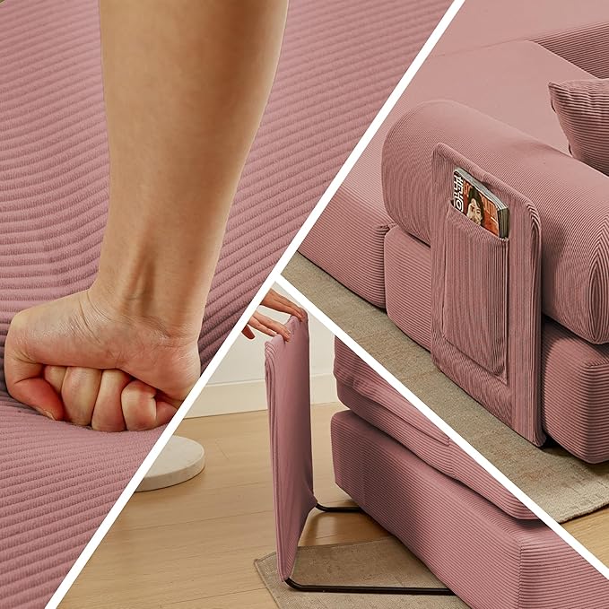 107" Oversized Convertible Sleeper Sofa Bed, Corduroy L Shape Sectional Couch, Folding Sofa Bed with Side Pocket, Modern Cloud Floor Mattress Couch, Modular Sofa for Living Room, Pink