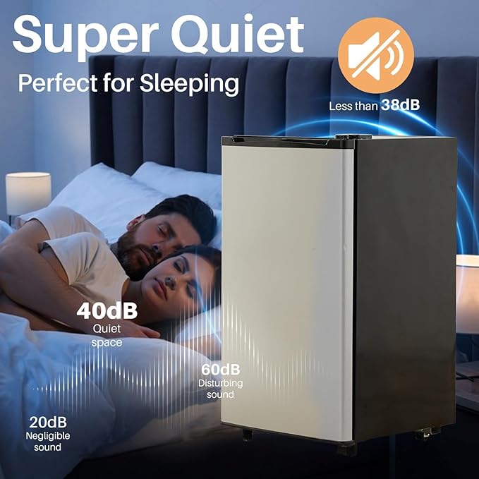 - ๐ Quiet and Functional Design: Operating at a whisper-quiet noise level of 38 dB, the compact refrigerator is perfect for environments requiring minimal noise, such as bedrooms or shared office spaces.