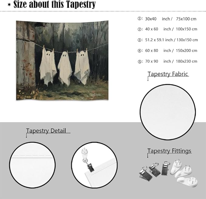 Vintage Halloween Tapestry Funny Ghosts on Clothesline Tapestry Wall Hanging Farmhouse Gothic Room Decor Spooky Ghost Prints for Dark Academia Halloween Party House Decoration Tapestries 30x40inch